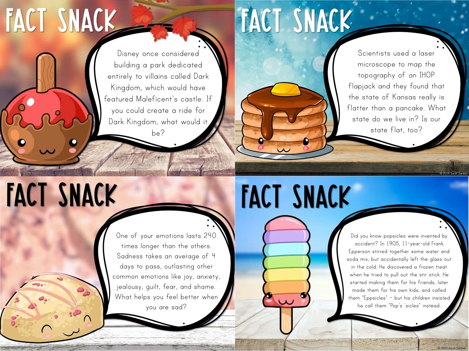 Snack time doesn’t just have to be for munching on apples and crackers - it can be the perfect time to feed your students’ brains and build classroom community! Using Fact Snacks in your classroom? Be sure to tag me on Instagram @sarahgardnerteaching!