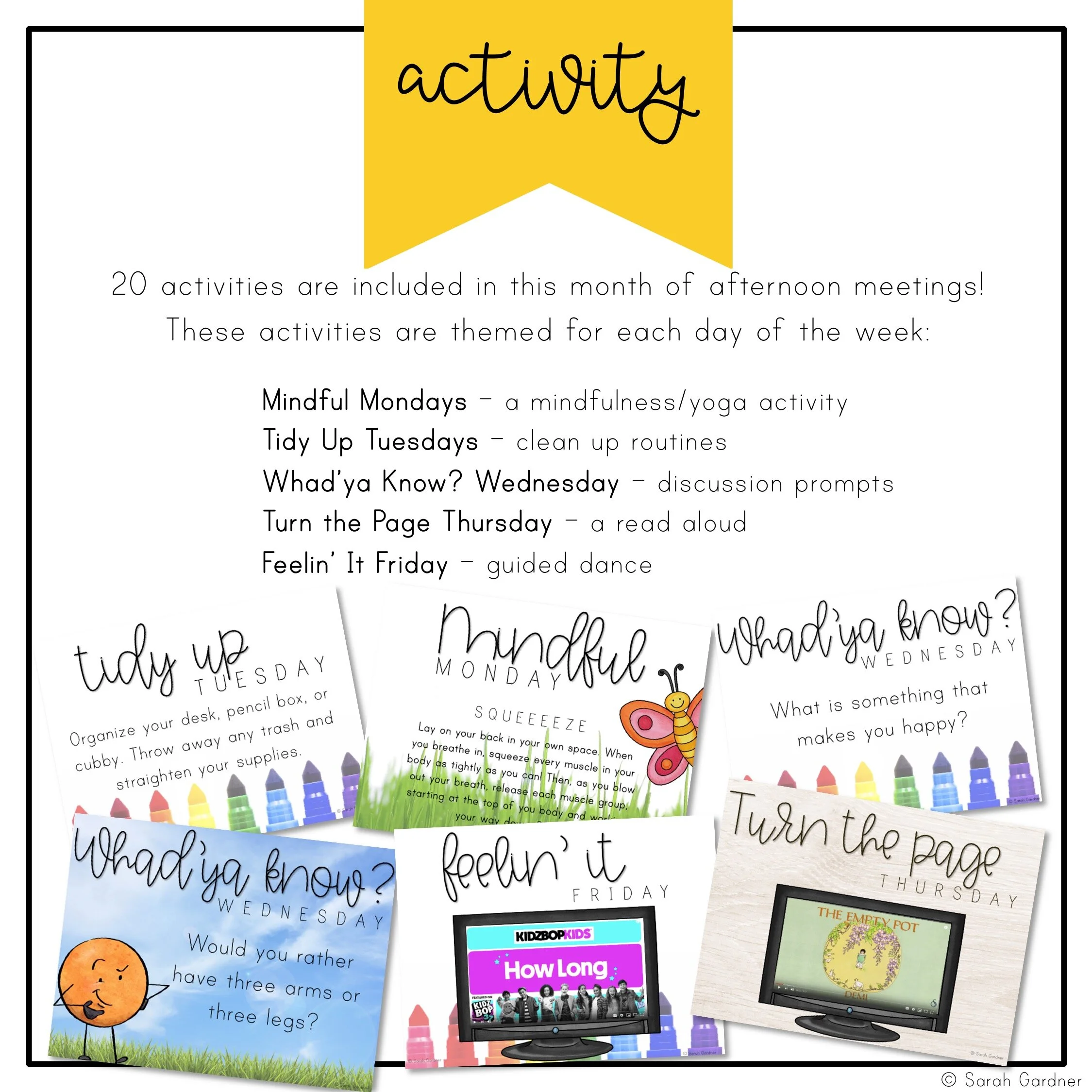 My afternoon meetings include an activity that’s already planned for you for each day of the school year. The best part of these activities is that the majority of them can be done semi-independently while you pass out last-minute notes, figure out last-minute dismissal changes, and prep for the next day.