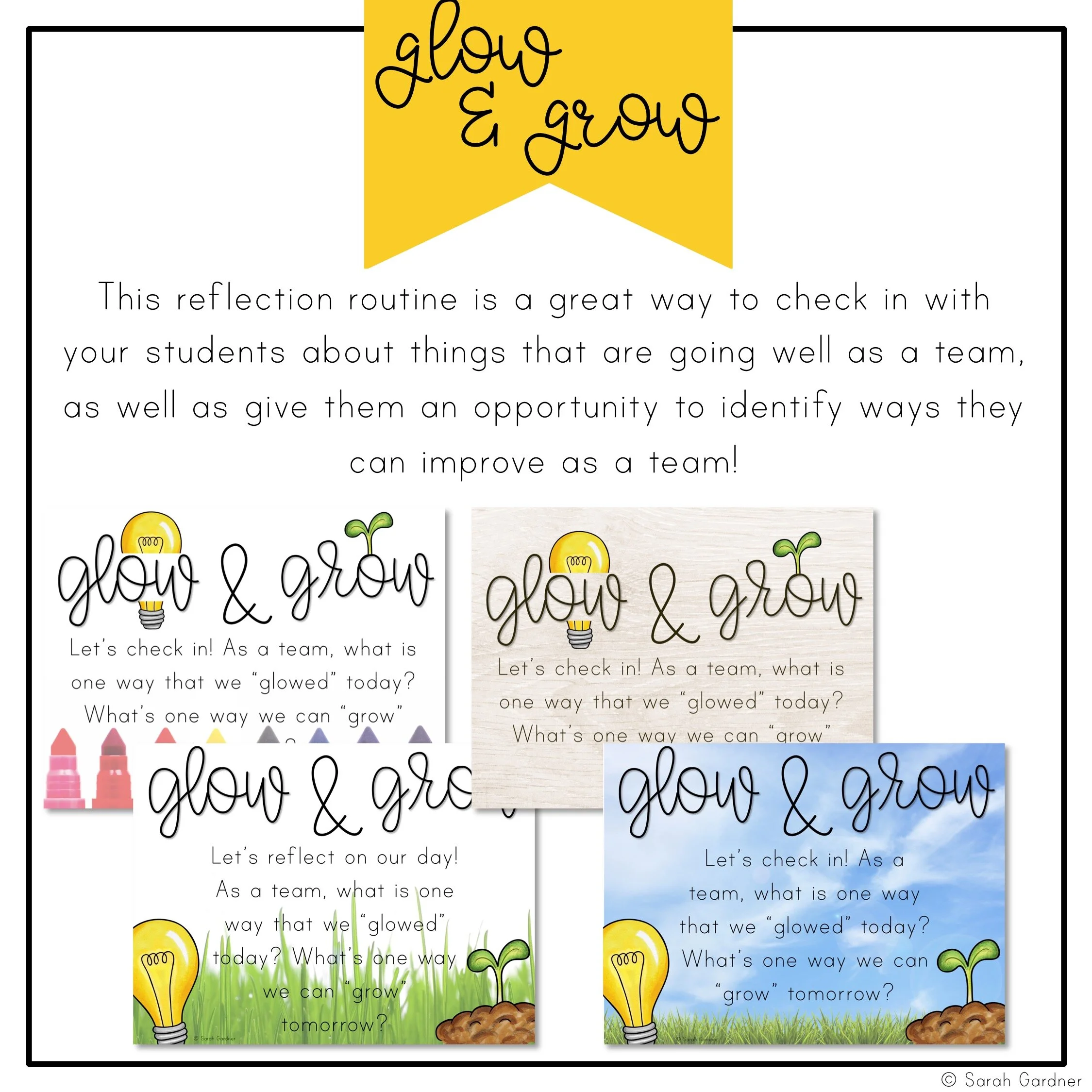 A daily Glow & Grow reflection comes next. We celebrate our successes make a plan of action for the next day. Each day of afternoon meetings includes a Glow & Grow slide already prepped and ready to go.