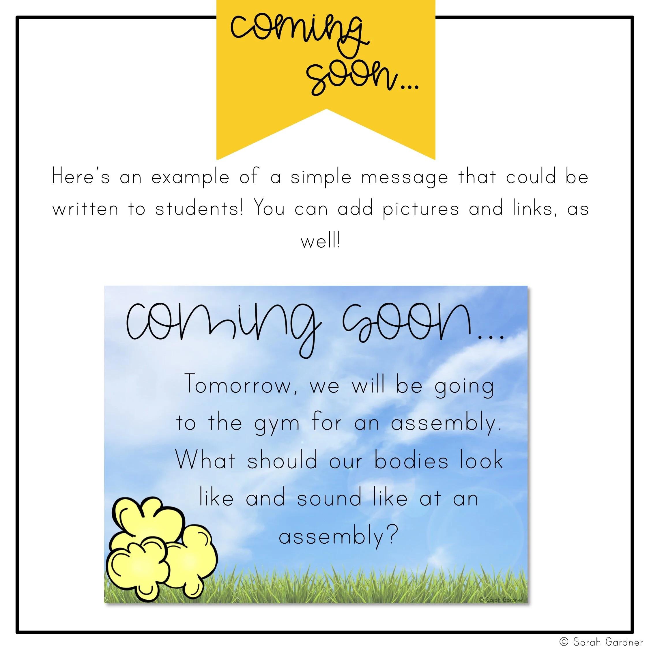 I use the “coming soon” slides to give students a heads up on anything they need to know or remember for the next day. This is a great time to review assembly expectations or remind students about spirit days. I’ve included blank “coming soon” templates for each week of my afternoon meetings.