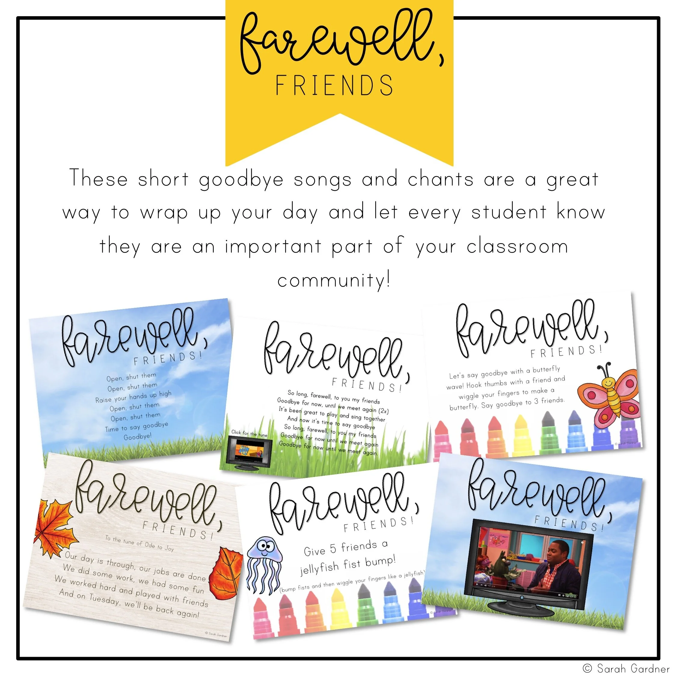 During morning meetings, we greet each other, so it only makes sense that we should say goodbye to our friends as well! Each day, I’ve planned a different way for students to say goodbye to their friends. Some of these are quick, whole-group goodbyes and others allow each student to say goodbye by name.