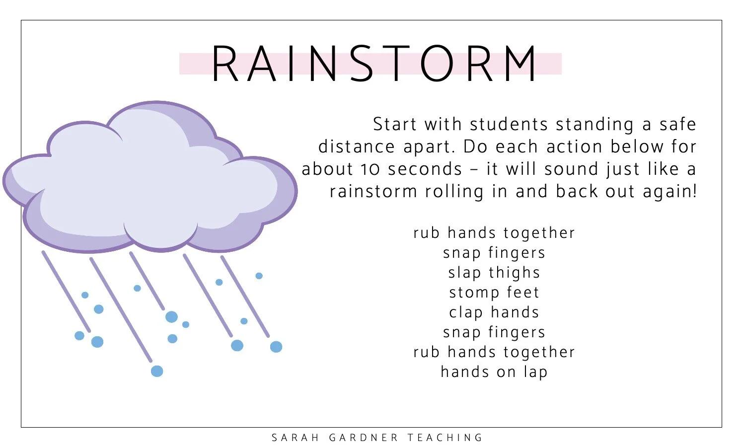 This is one of my students’ favorite activities! It’s also a great activity for days when you’re short on time. In this activity, students use their hands and feet to create the sounds of a rainstorm rolling in and gradually getting more intense.