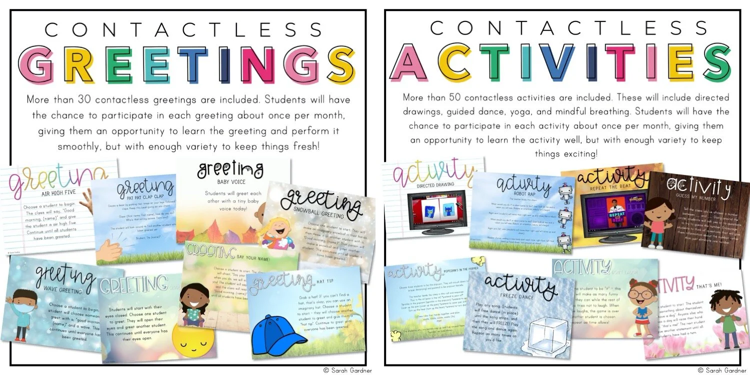 Needing more ideas? I’ve put together an entire year’s worth of my favorite contactless greetings and activities into one place! You can use these paperless slides in person OR virtually and keep the benefits of morning meetings going for your students even during unpredictable schedule changes. Click HERE or on the images below to take a closer look!
