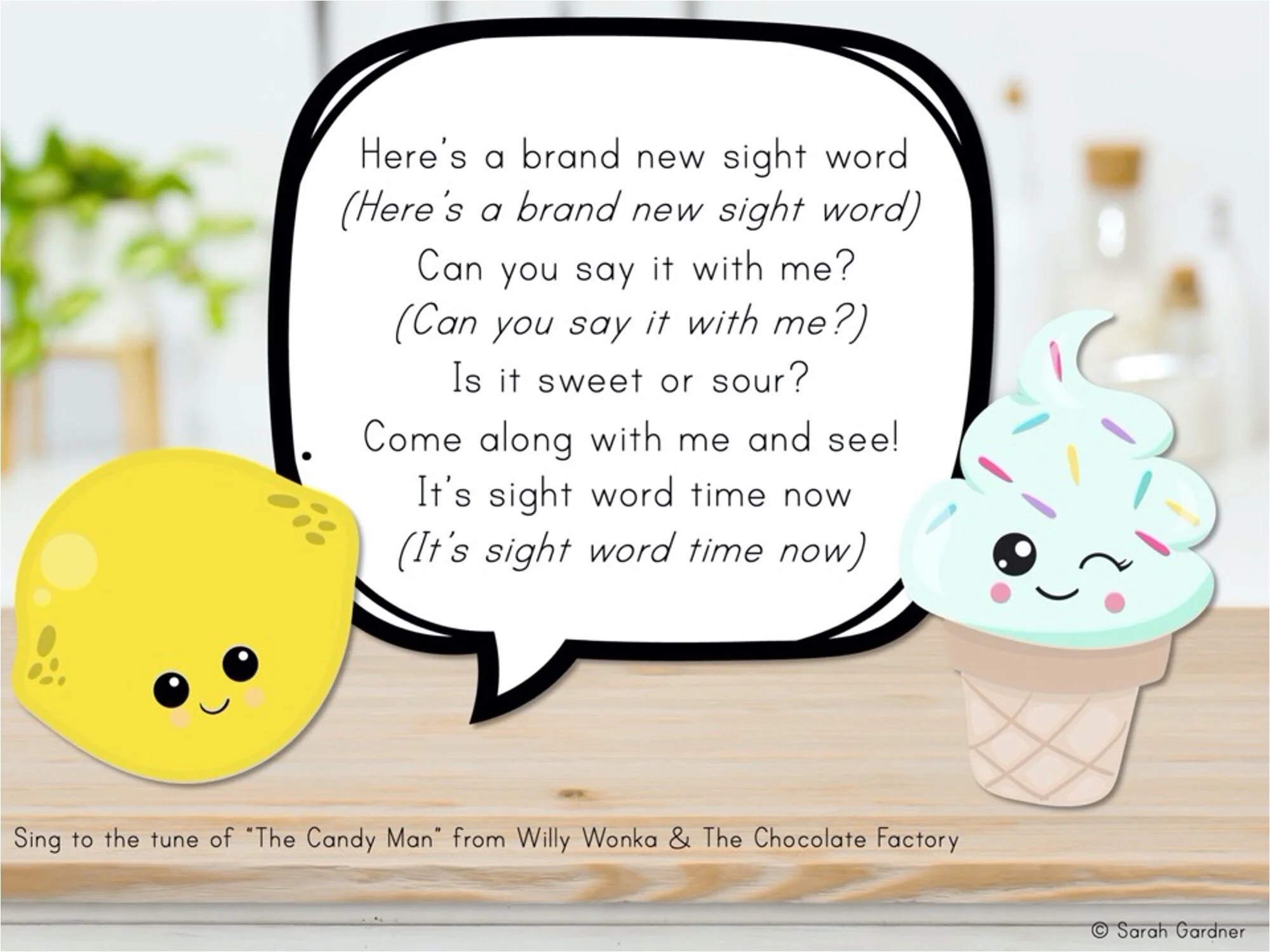 The first step of the sweet and sour word routine is to reveal to students if the new word is a sweet word or a sour word. I love to build the anticipation with a little sight word song at the beginning of each lesson. My husband and I spent way too much time coming up with this little sight word jingle to the tune of “The Candy Man Can.” I guess true love is writing educational jingles on a Saturday morning?