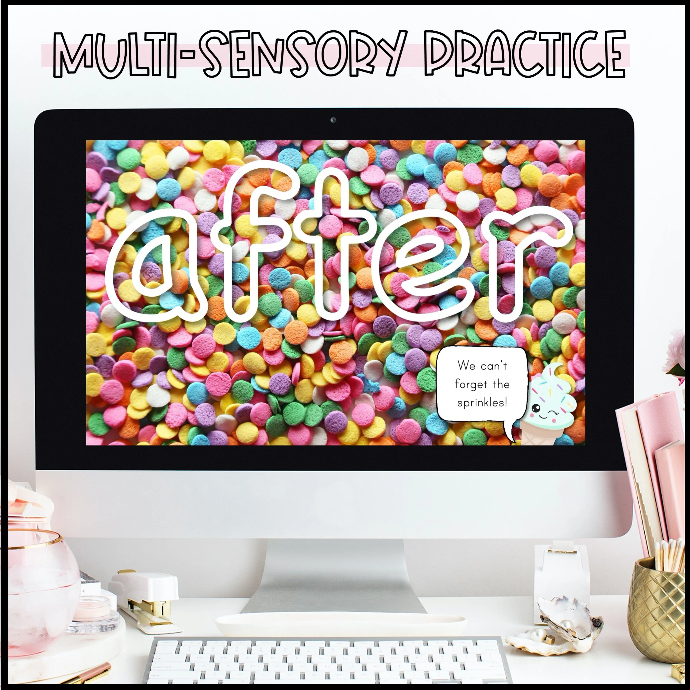 Now, I actually teach sight word lessons (as it turns out, putting a sight word slideshow on the board isn't actually teaching…). We map the sounds, reinforce with interactive chants, and practice with multisensory centers. It's life-changing.