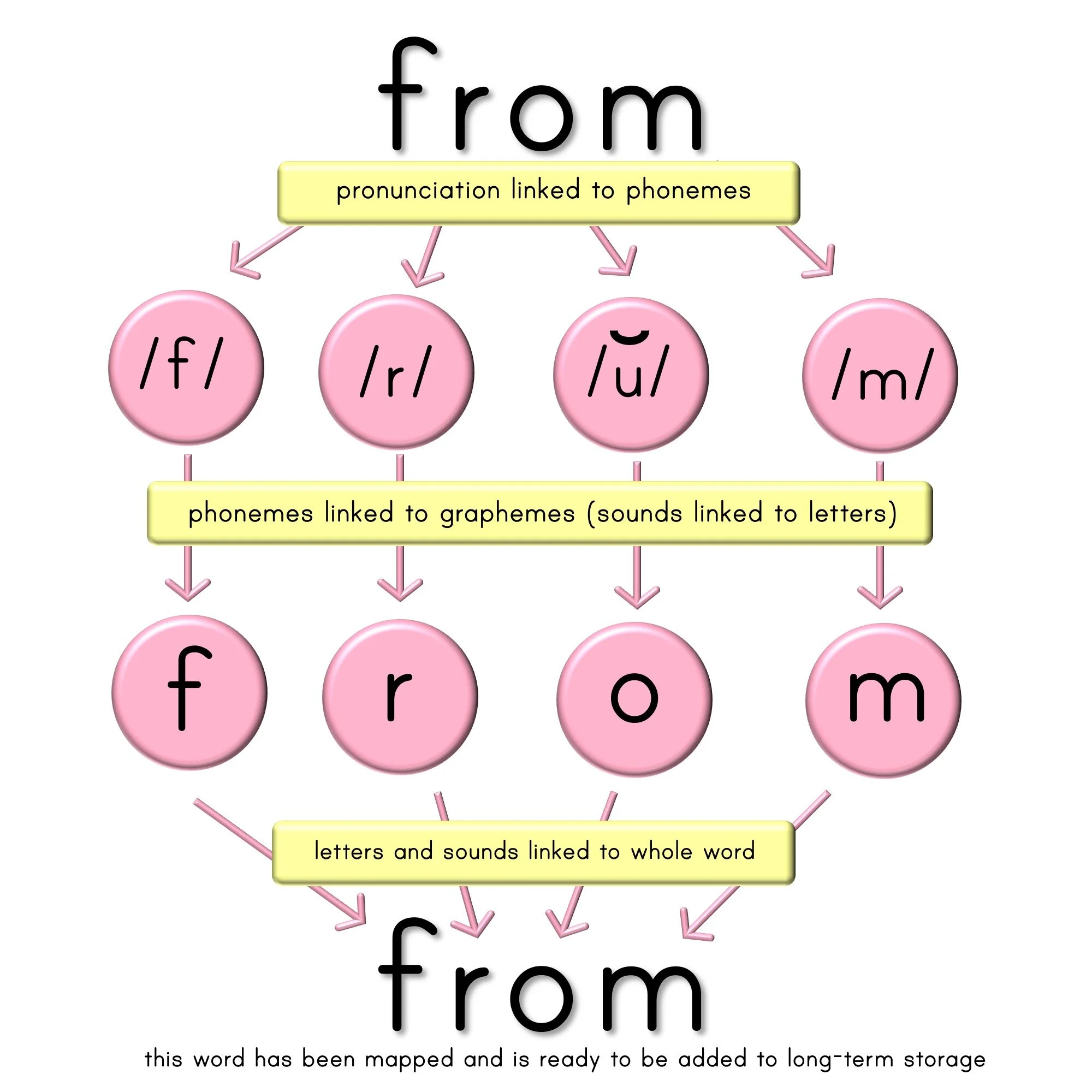 We help them map the sounds. When students use the phoneme-grapheme (sound-letter) relationship to map unfamiliar words, these words can be added to their orthographic lexicon. This is called orthographic mapping. Let’s take a look at what orthographic mapping could look like with a common sight word below: