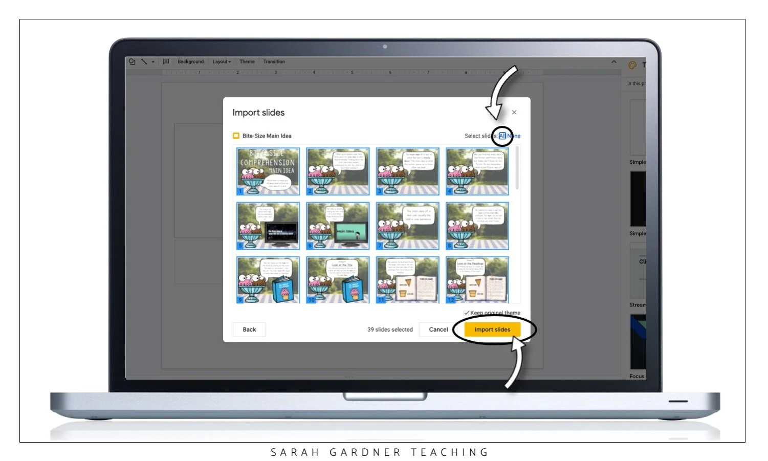 Once your file finishes loading, you’ll have the option to select the slides you want. I like to click the “All” button in the upper right-hand corner, which will automatically highlight all of the slides in that file.